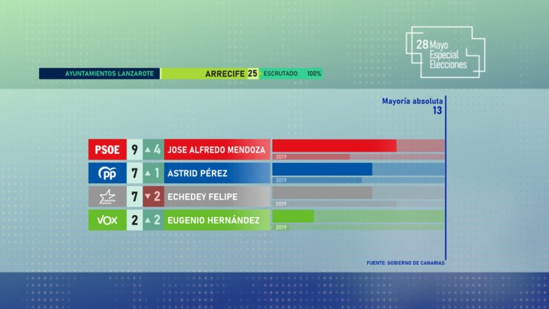 Al 100 % de los votos escrutados la composición del Ayuntamiento de Arrecife queda de la siguiente manera: