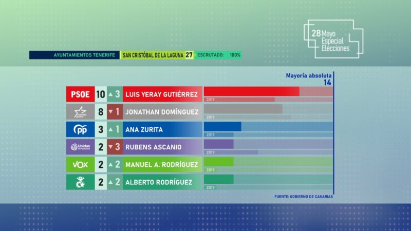 Al 100 % de los votos escrutados, el Ayuntamiento de San Cristóbal de La Laguna queda con la siguiente composición: