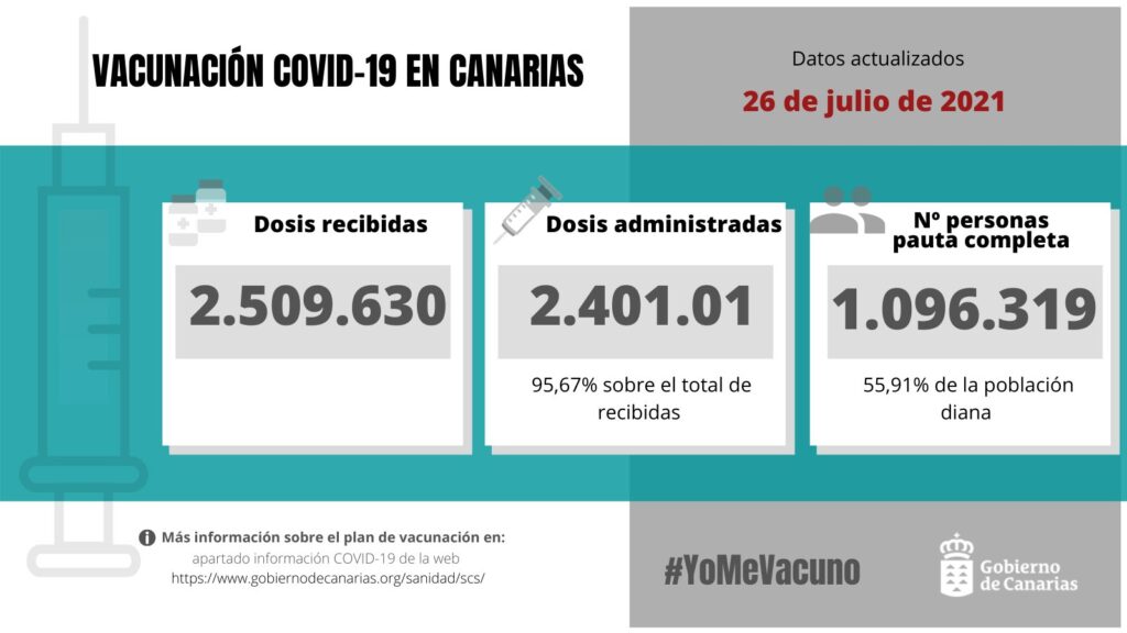 La Consejería de Sanidad del Gobierno de Canarias ha administrado 2.401.011 dosis de la vacuna contra la COVID-19 de las 2.509.630 recibidas, lo que representa un 95,67 por ciento. Además, hasta ayer se había logrado la inmunización de 1.096.319 personas que ya han recibido la pauta vacunal completa contra el coronavirus, lo que supone el 55,91 por ciento de la población diana mayor de 12 años de Canarias.