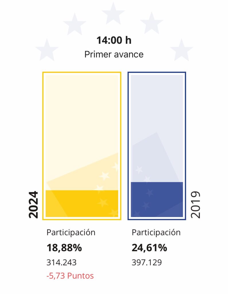 La participación en las elecciones europeas de este domingo 9 de junio ha alcanzado el 18,87% en Canarias hasta las 13.00 horas. Por tanto, ello supone casi seis puntos menos (-5,74%) que en los comicios europeos celebrados en mayo de 2019. En ese momento, la participación a la misma hora era del 24,61%.