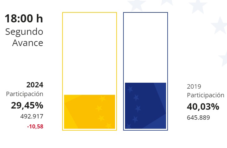 La participación en las elecciones europeas de este domingo 9 de junio ha alcanzado el 29,45% en Canarias hasta las 17.00 horas, lo que supone casi 11 puntos menos (-10,58 puntos) que en los comicios europeos celebrados en mayo de 2019, cuando la participación a la misma hora era del 40,03%.