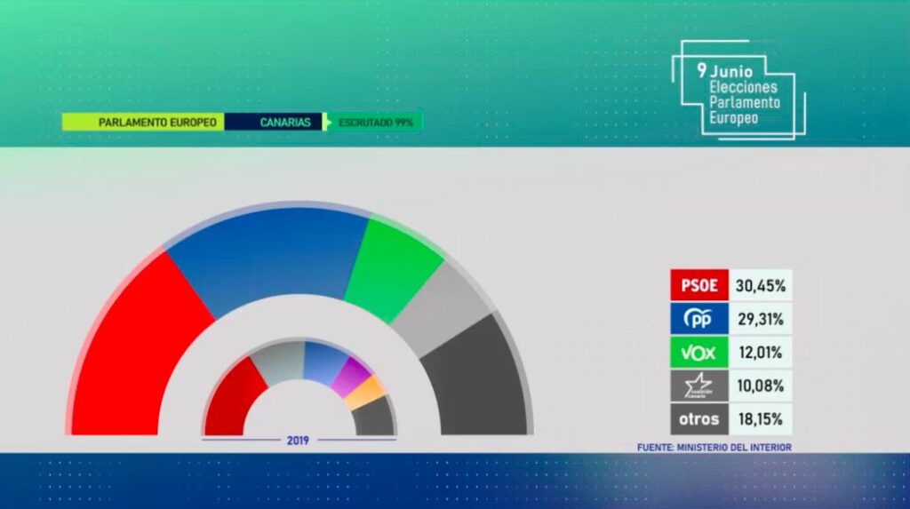 El PSOE ha ganado las elecciones europeas en Canarias, con el 30,46% de los votos, seguido muy de cerca por el PP con un 29,27%, con Vox situado en tercer lugar con el 12,01% y Coalición Canaria cuarta, con 10,09%