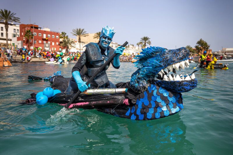 Ataviados con sus mejores disfraces, los y las participantes en esta multitudinaria cabalgata flotante disfrazan a sus balsas artesanales y se echan al agua a navegar, o al menos a flotar. Y es que el objetivo de esta regata carnavalera es, además de divertirse, remar sobre estos artilugios hidrodinámicos sin motor durante los 500 metros que hay entre el muelle comercial de Puerto del Rosario y Playa Chica.