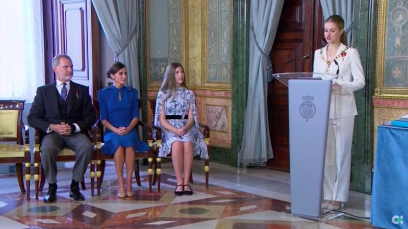 Para su acto institucional más importante como futura Reina y su compromiso con la nación, Leonor de Borbón ha escogido un traje de chaqueta con pantalón blanco, un color que lo significado de una monarquía renovada, es luz, positividad, energía, renovación, paz y humildad», ha señalado el profesor del protocolo social y etiqueta, Miguel del Amo.