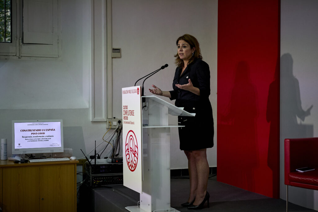 La portavoz del PSOE en el Congreso, Adriana Lastra, ha clausurado este viernes el curso ‘Construyendo la España post-covid’ organizado por la Fundación Pablo Iglesias en la Universidad Complutense de Madrid. Durante la clausura Lastra critica a un PP que «solo sabe descalificar e intentar destruir el Gobierno».