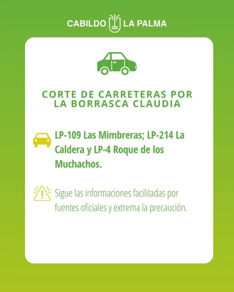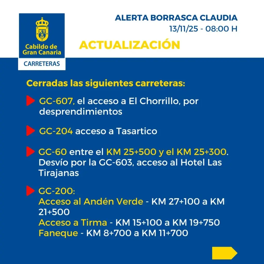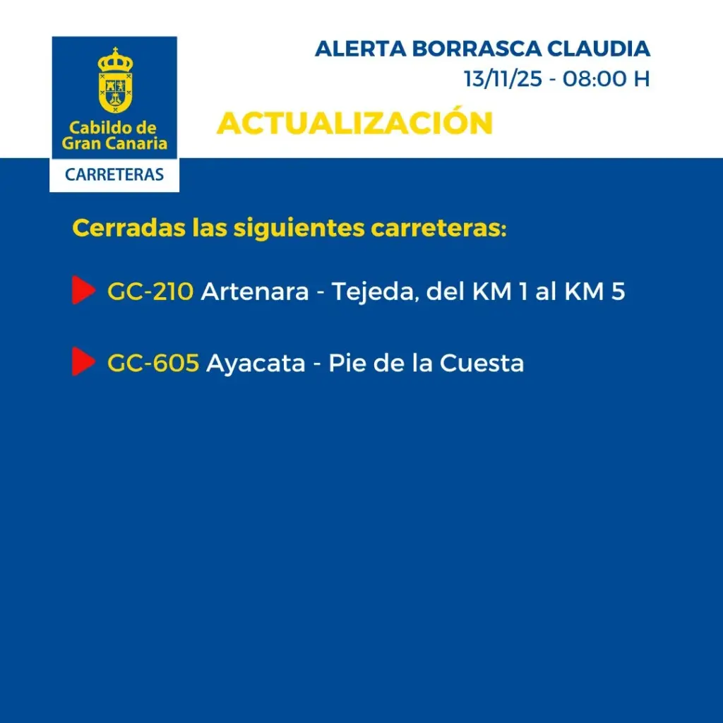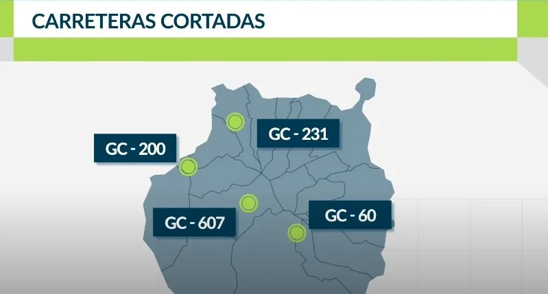 En Gran Canaria permanecen cerradas al tráfico las carreteras del Valle de Agaete GC-231, en su último tramo, el de El Sao; los accesos a Andén Verde, Tirma y Faneque. En la cumbre la GC-210 en Artenara, la de la presa de Las Niñas y por desprendimientos la GC-607, de El Chorrillo, en Tejeda. También se prohíbe circular por el barranco de Tasartico y un pequeño tramo de 200 metros de la GC-60, entre Fataga y Tunte.
