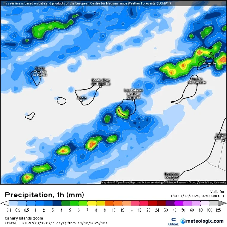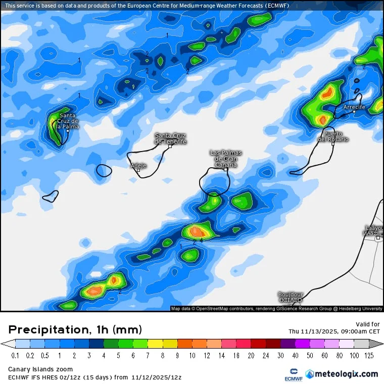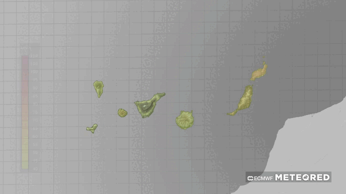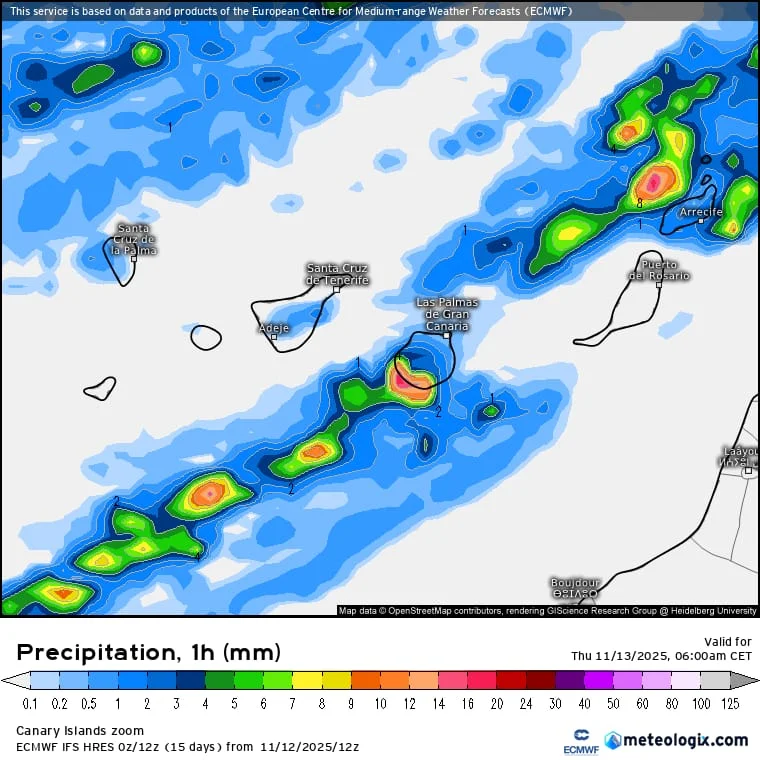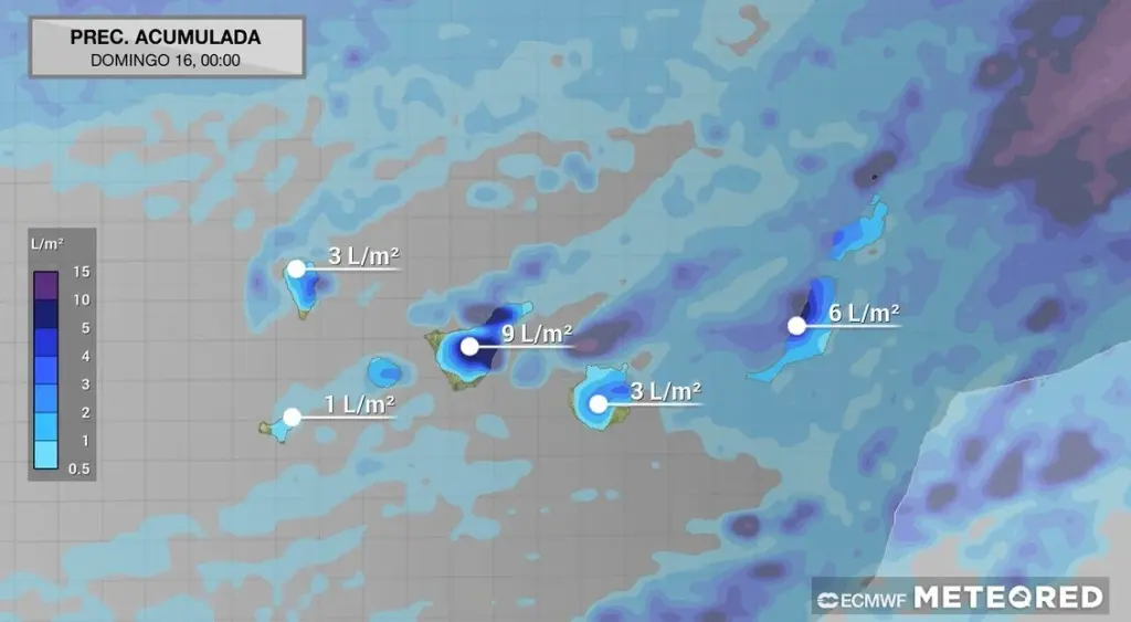 Se prevé acumulados que probablemente alcanzarán y superarán los 20 – 30 mm en una hora y de 80 – 100 mm en doce horas en las islas de mayor relieve. Se prevé acumulados que podrían alcanzar y superar los 15 mm en una hora en Lanzarote y Fuerteventura.