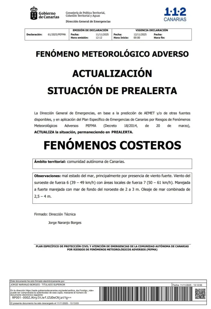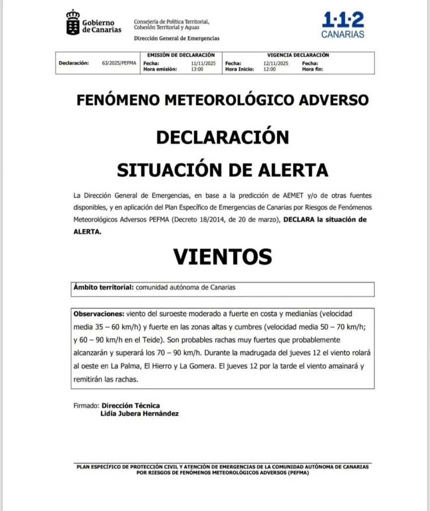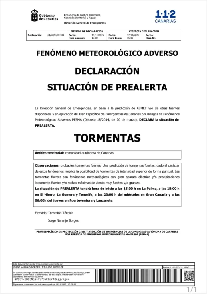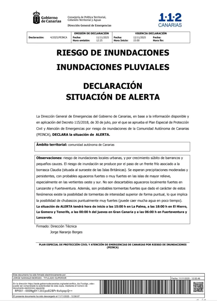 El Gobierno de Canarias, a través de la Dirección General de Emergencias, declaró la situación de alerta por lluvias a partir de las 15:00 horas de este miércoles, 12 de noviembre.