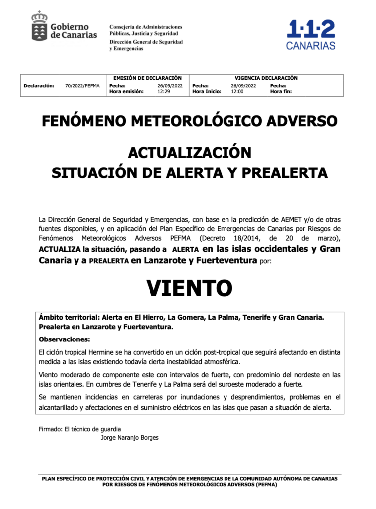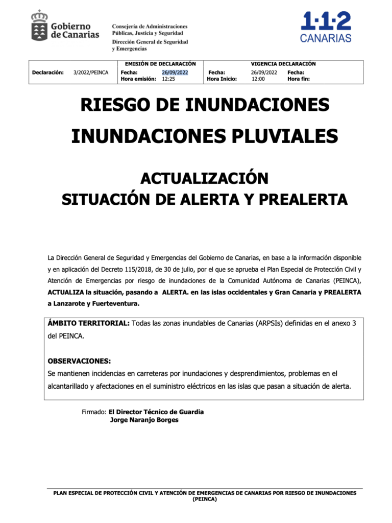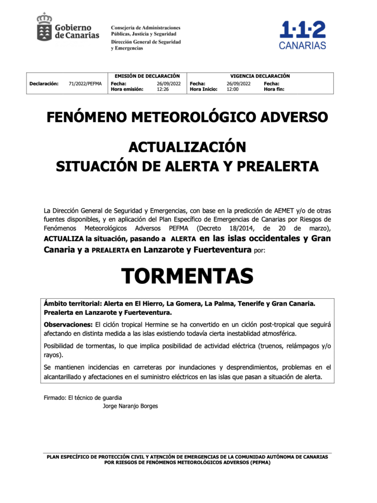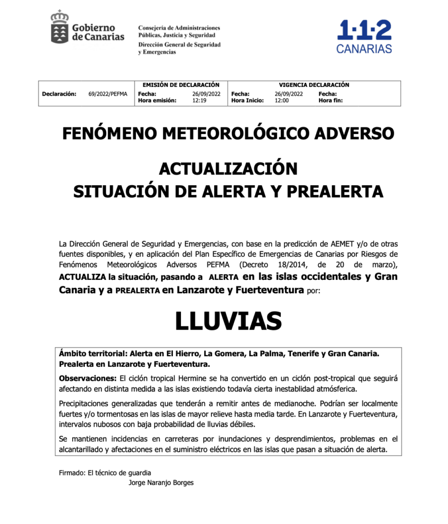 InicioNoticias Alerta por lluvias, tormentas, vientos y riesgo de inundaciones en las islas occidentales y Gran Canaria Redacción RTVC 26 septiembre 2022 15:41 FacebookXWhatsAppEmail Noticias Relacionadas Otras Noticias Más de 20 humoristas canarios se reúnen en la tercera edición de ‘La Quedada del Año’ Las familias rechazan la ley de autoridad docente en el Parlamento Manuel Merillas y Sara Alonso conquistan Acantilados del Norte en La Palma Detenidas 13 personas por traficar con droga y extorsionar a consumidores vulnerables para cometer delitos Gran Canaria se prepara para el regreso del New Kumite Rules