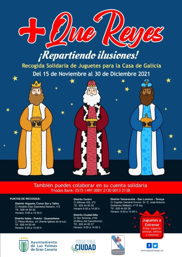 La Casa de Galicia y el Ayuntamiento de Las Palmas de Gran Canaria anunciaron el pasado mes de noviembre la tradicional campaña benéfica que viene desarrollando la entidad social desde hace más de siete décadas en la ciudad para que ningún niño se quede sin juguetes en Navidad. El año pasado, la campaña ‘+ Que Reyes’ llegó a 3.280 menores de 10 municipios de la Isla.