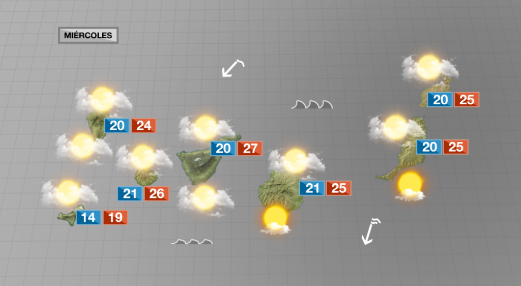 TENERIFE: Muchas nubes durante la mañana por el norte y el nordeste, e intervalos de evolución en las medianías. El tiempo más soleado, en las cumbres por encima de unos 1600m. Viento alisio flojo a moderado en la costa.