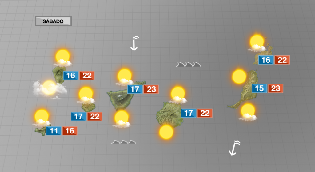 Este sábado veremos menos nubes. Algunas de tipo bajo a primera hora por el norte, e intervalos dispersos de evolución en medianías. En el resto, ambiente soleado y agradable, con ligera calima en la provincia oriental.