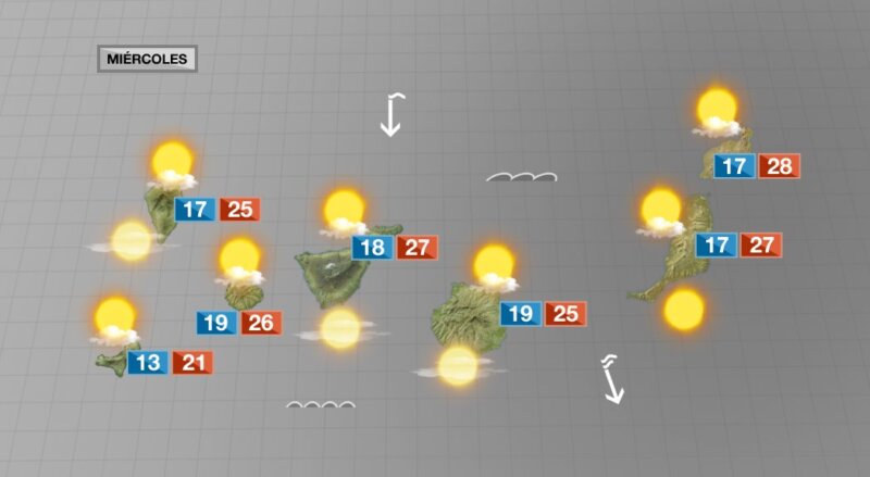 Los termómetros van a seguir subiendo a lo largo de la semana, dejando un ambiente veraniego en Canarias. Este miércoles predominará otra jornada soleada y veraniega. Las únicas nubes, a cota baja, casi de verano, a menos de 600 metros de altitud por el norte de las islas. Se verán también algunas pinceladas de nubes altas por el oeste.