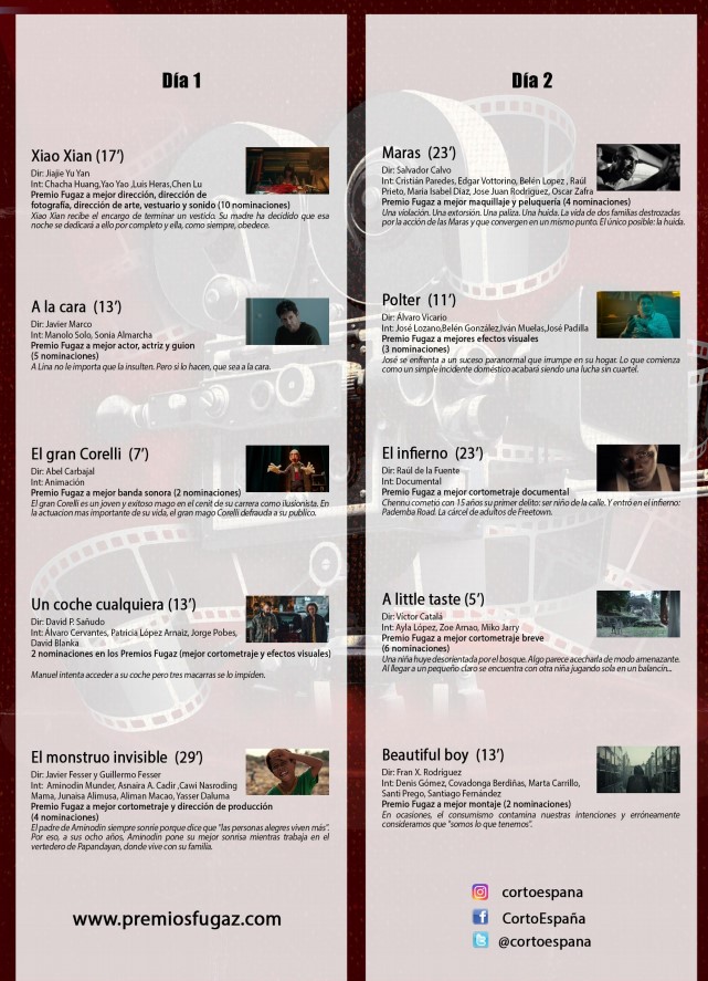 En esta edición serán 12 trabajos, a razón de 6 películas cortas por día, que mostrarán los cortometrajes más destacados y premiados de la última edición de los Premios Fugaz al Cortometraje Español.