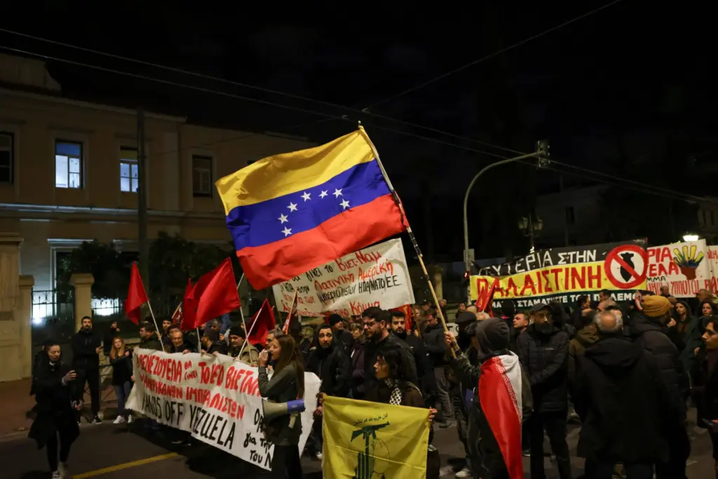 Un hombre sostiene una bandera estadounidense en llamas, mientras la gente, incluidos miembros del Partido Comunista Griego (KKE), se manifiesta contra la captura del presidente venezolano Nicolás Maduro, luego de que Estados Unidos atacara a Venezuela y capturara al presidente Maduro, afuera de la Embajada de Estados Unidos, en Atenas, Grecia, el 3 de enero de 2026. REUTERS/Louiza VradiMiembros del Partido Comunista Griego (KKE) se manifiestan contra la captura del presidente venezolano Nicolás Maduro, luego de que Estados Unidos atacara a Venezuela y capturara al presidente Maduro, frente a la Embajada de Estados Unidos, en Atenas, Grecia, el 3 de enero de 2026. REUTERS/Louiza Vradi