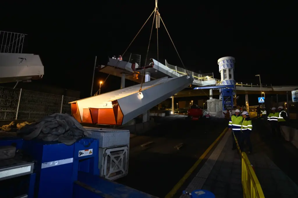 El Cabildo de Tenerife, a través de la Consejería de Carreteras, ha procedido, en la noche de este lunes a la instalación del tramo de escaleras de conexión entre el Intercambiador de La Laguna. Se trata de una pieza de 10 toneladas de peso y 10 metros de longitud.