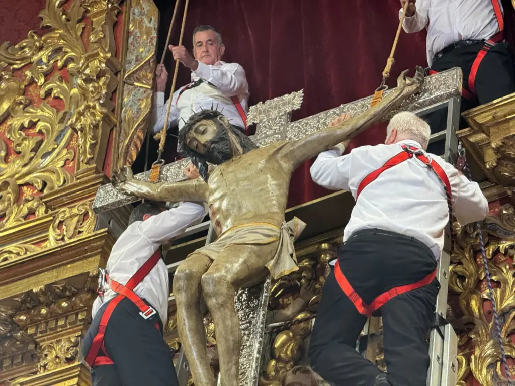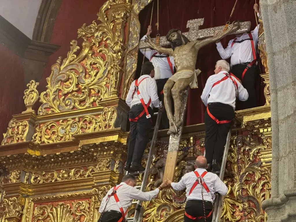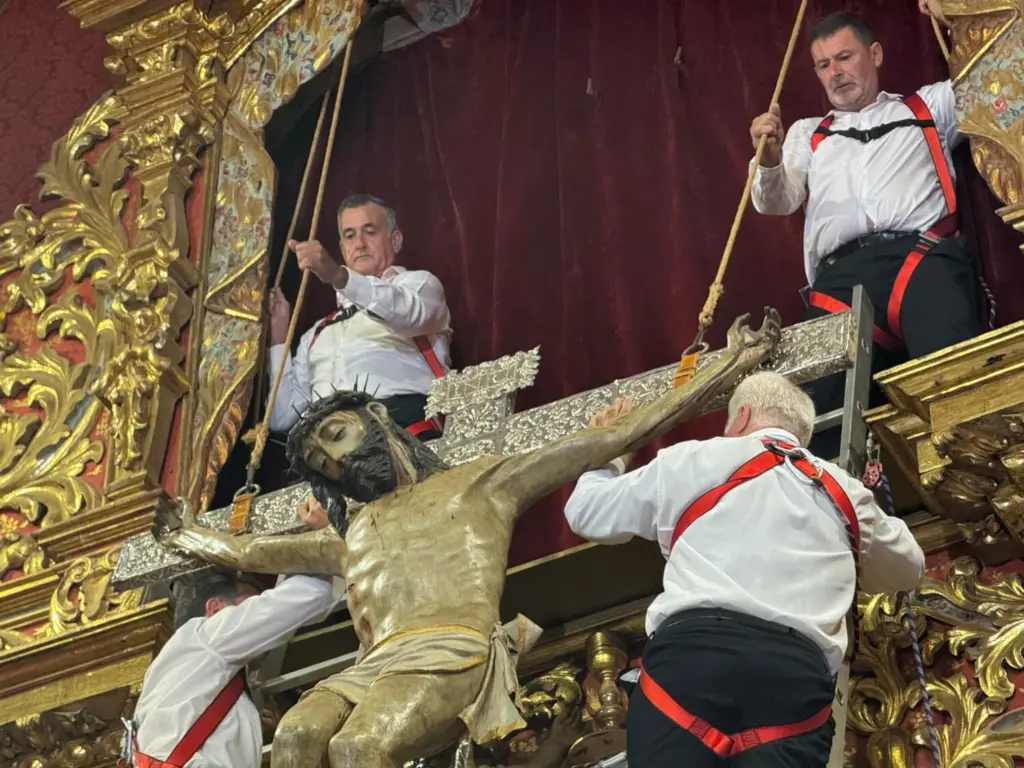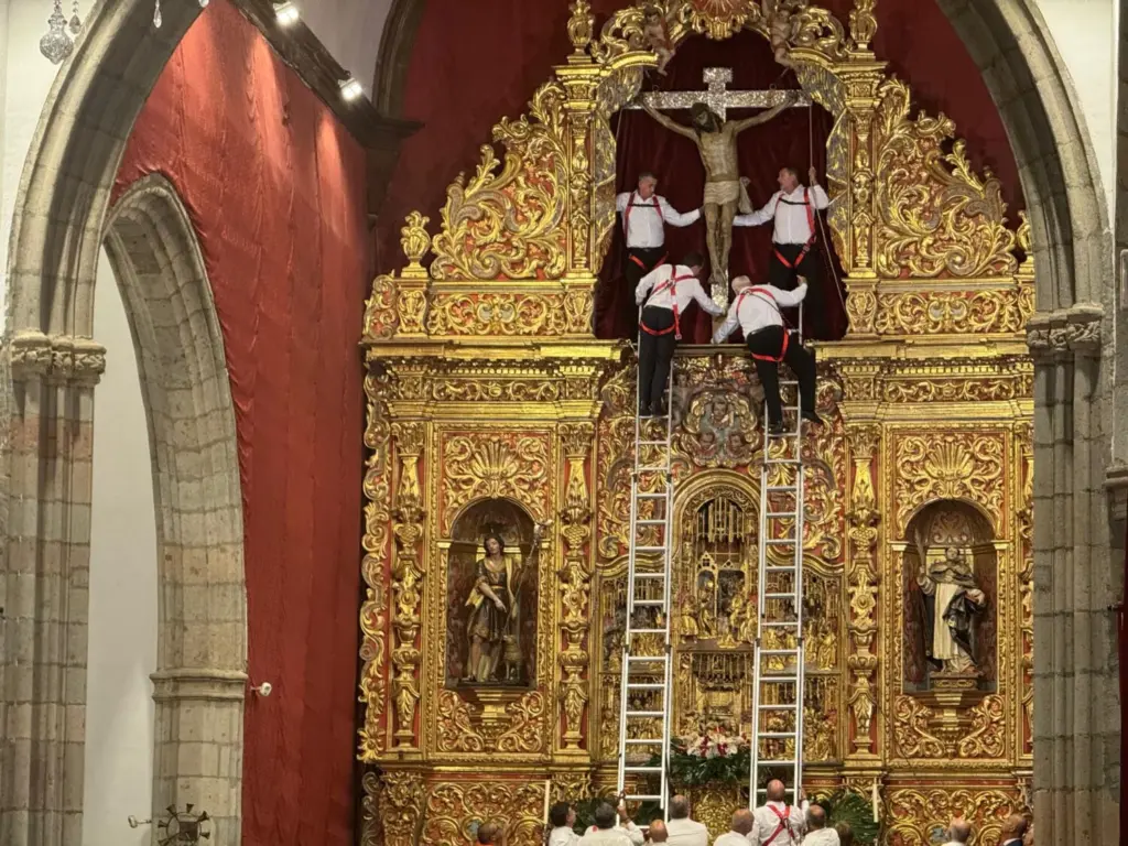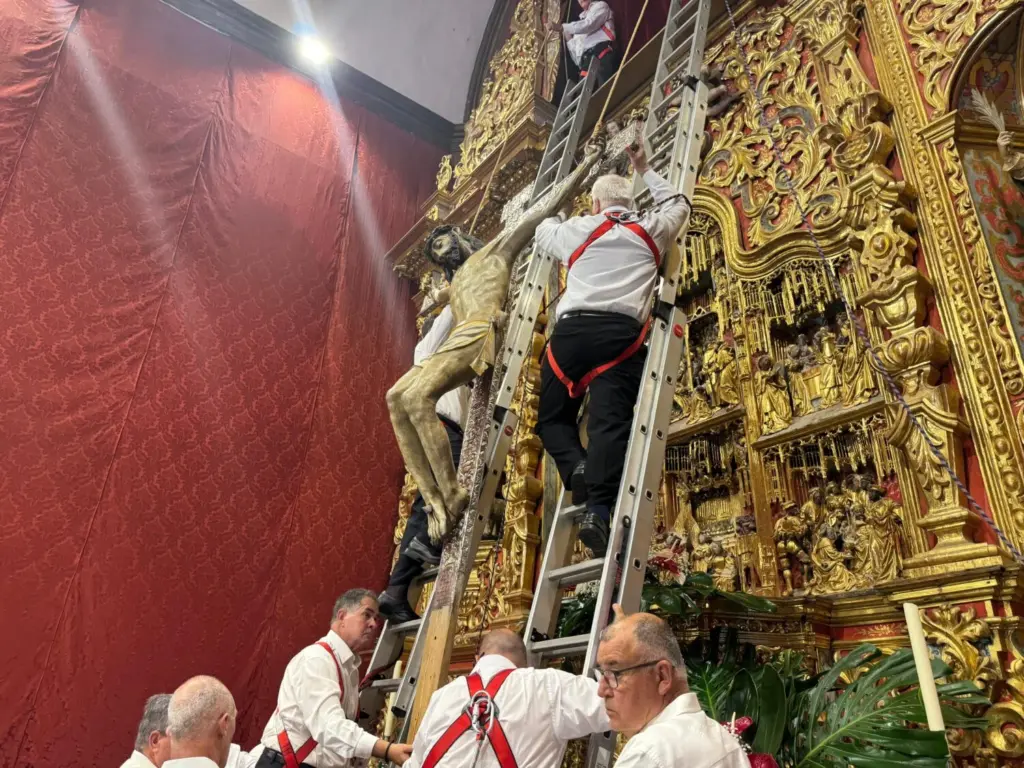 En un silencio reverente, los seis portadores habituales subieron a las escaleras del retablo flamenco. El Cristo fue bajando lentamente, mientras la emoción crecía entre los presentes. Las lágrimas brotaron en muchos rostros devotos al ver cómo la imagen se acercaba al altar.