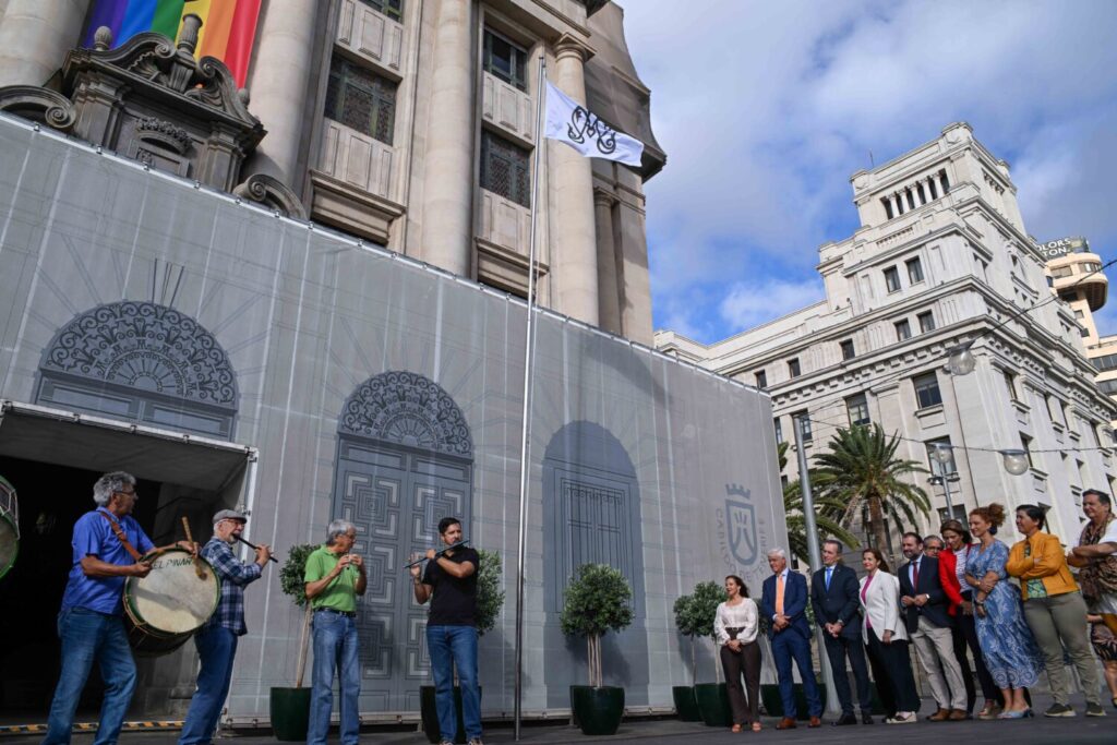 Entre chácaras, pitos y tambores el Cabildo de Tenerife ha izado la bandera de la Virgen de los Reyes en la fachada de la primera institución insular.