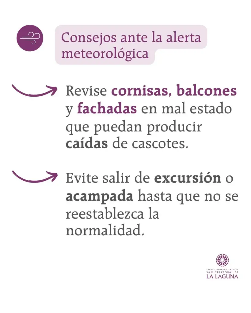 Ante la situación de fuertes vientos, la Dirección General de Seguridad y Emergencias del Ayuntamiento de Las Palmas de Gran Canaria plantea una serie de recomendaciones para evitar daños, como cerrar puertas y ventanas para evitar corrientes de aire que puedan llevar a la rotura o caída de cristales. También retirar de balcones y azoteas las macetas y todos los objetos que puedan caer a la calle.