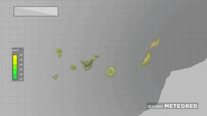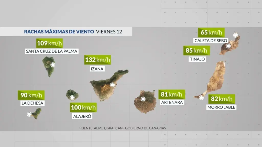 A medida que avance el viernes, la intensidad del viento irá ganando fuerza. Se esperan rachas de entre 80 y 90 km/h, aunque en las islas occidentales y en el entorno del Parque Nacional del Teide podrían superar con facilidad los 100 km/h, según algunos modelos.