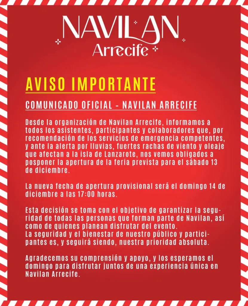 La organización de Navilan Arrecife pospone la apertura de la feria prevista para el sábado 13 de diciembre por alerta de lluvias y fuertes rachas de viento en Lanzarote.