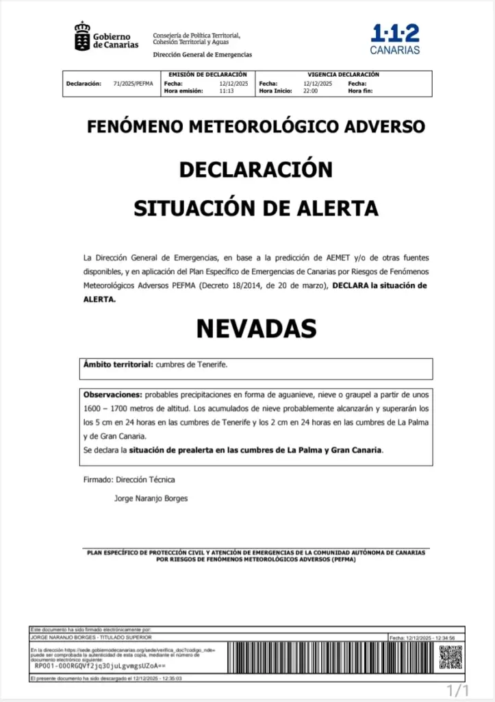La presencia de aire frío en altura, característica de esta borrasca, podría bajar las temperaturas por debajo de cero en zonas altas. Esto hará posible la aparición de nevadas en Tenerife, La Palma y Gran Canaria, siempre por encima de los 2.000 metros.