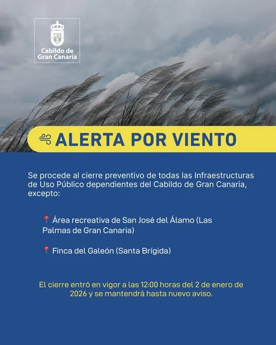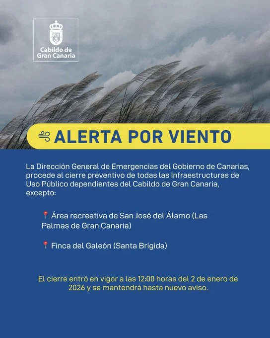 Debido a la declaración de alerta por viento por la Dirección General de Emergencias del Gobierno de Canarias, se ha procedido al cierre preventivo de infraestructuras de uso público dependientes del Cabildo de Gran Canaria, excepto el Área recreativa de San José del Álamo, en Las Palmas de Gran Canaria y la Finca del Galeón, en Santa Brígida
