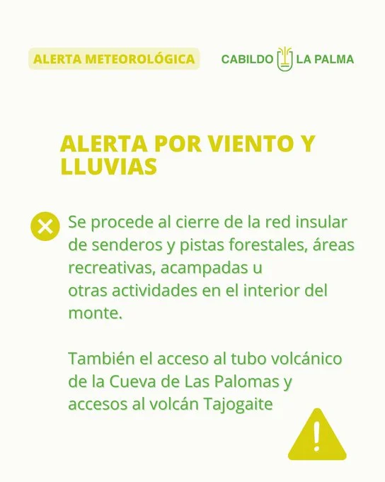 E l Cabildo de La Palma activó el Peinpal debido a la alerta meteorológica. Ha procedido al cierre de senderos, pistas y accesos a la montaña. También ha cerrado las carreteras LP-4, LP-109 y LP-214 por precaución.