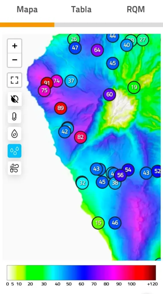 Deja precipitaciones débiles a moderadas y viento moderado a fuerte del Suroeste. Por el momento, las rachas más intensas se han registrado en las cumbres herreñas con más de 80 km/h en Malpaso y también en Sabinosa