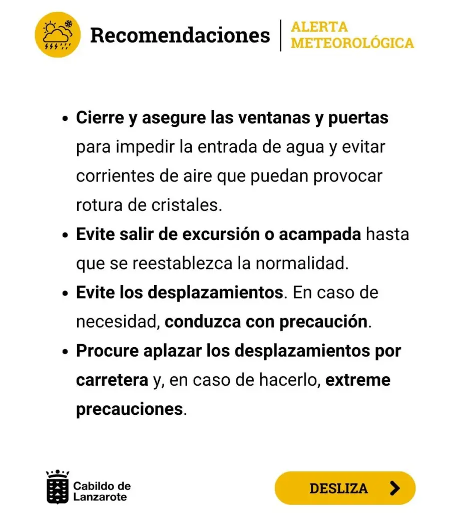 La institución insular insta en un comunicado a evitar la cercanía a cauces de barrancos, no transitar ni estacionar en zonas inundables, extremar la precaución en áreas costeras, y circular con prudencia por la red viaria insular, ante la posibilidad de desprendimientos derivados de las precipitaciones y el viento.