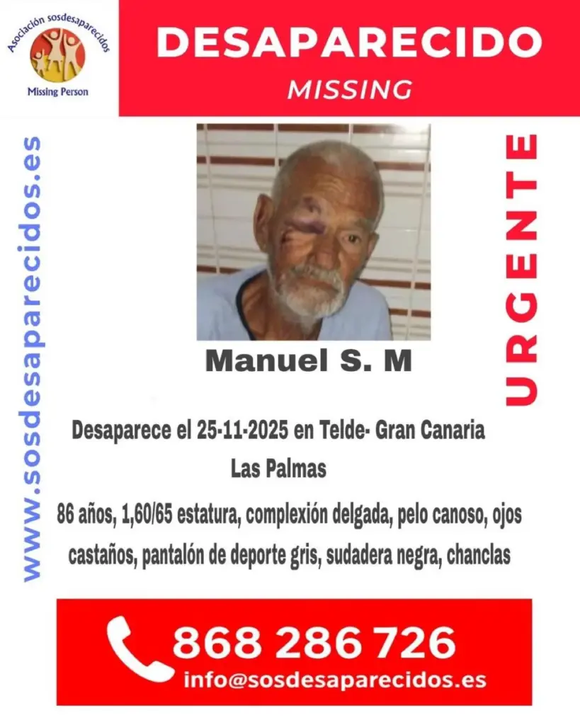 Manuel, varón de 86 años, desapareció este martes en el municipio grancanario de Telde. Según publica SOS Desaparecidos, es un caso urgente porque se trata de una persona vulnerable.