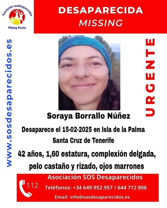 La Asociación SOS Desaparecidos ha emitido una alerta de búsqueda para localizar a Soraya Borrallo Núñez, una mujer de 42 años a la que se perdió la pista el pasado 15 de febrero en La Palma. La mujer mide 1,60 metros y es de complexión delgada. Tiene el pelo rizado y castaño, y los ojos marrones.