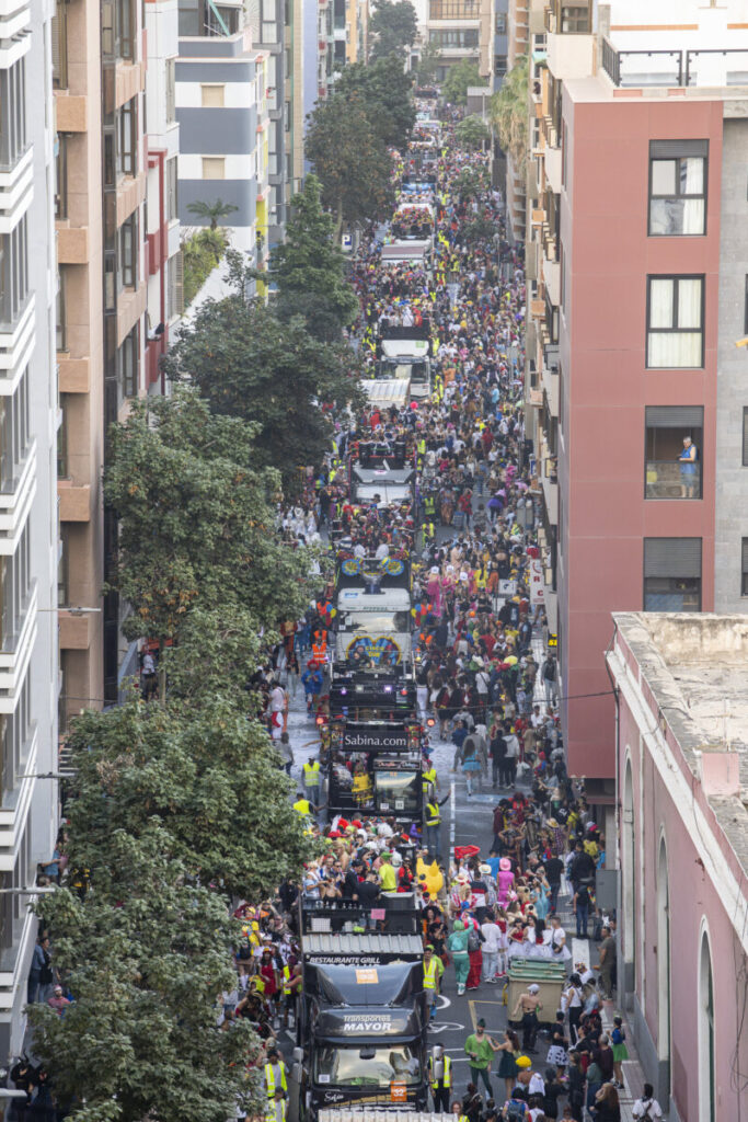 Esta extensa serpentina multicolor que aguardan con pasión los devotos de las fiestas tardó cuatro horas en llegar con la cabecera a la meta, el Muelle Las Palmas, una distancia que la primera carroza alcanzó 20 minutos más tarde, a las 20:20 horas y que al poco sacaba a pasear a la última de las 110 carrozas: a las 20:30 horas salió la última de El Sebadal.