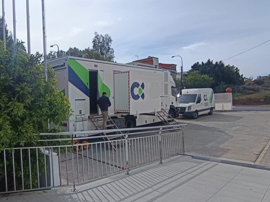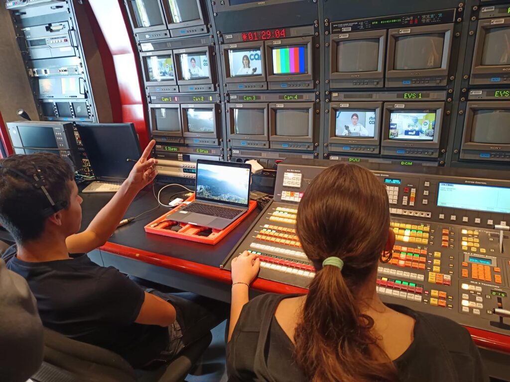 Mientras el interior del aula está tomado por los focos y las cámaras, en el exterior aguarda la unidad móvil de Televisión Canaria, donde los jóvenes experimentarán el trabajo que se realiza en la sala de control de realización de un exterior.