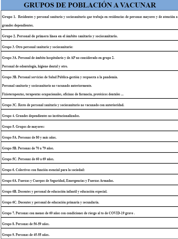 Tras la inmunización con dos dosis de los grupos 1 y 2 (los correspondientes a los residentes y trabajadores de centros sociosanitarios y a los profesionales sanitarios de primera línea), la vacunación continúa con el resto de grupos establecidos siguiendo el criterio de vulnerabilidad y exposición.