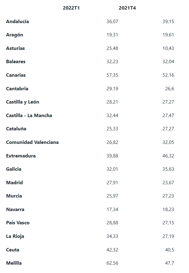 La siguiente tabla recoge la tasa de paro juvenil por comunidades y ciudades autónomas del primer trimestre de 2022 y el cuarto trimestre de 2021:
