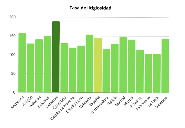 Tras la tasa de 188,7 de Canarias, se situaron las comunidades autónomas de Andalucía con una tasa del 156,8, Cataluña con 154,2, Baleares con 150,6 y Madrid con una tasa de 149). Todas estas encuentran por encima de la media del conjunto del país en litiogisidad. Por contra, las más bajas se produjeron en País Vasco (103,2), La Rioja (103,9) y Navarra (115,7).