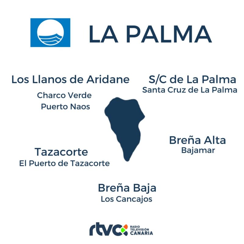 Breña Alta: Bajamar. Breña Baja: Los Cancajos. Los Llanos de Aridane: Charco Verde, Puerto Naos. Santa Cruz de La Palma: Santa Cruz de La Palma. Tazacorte: El Puerto de Tazacorte.