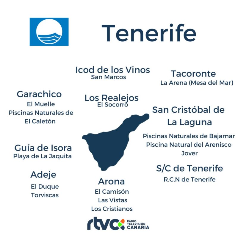 Adeje: El Duque, Torviscas. Arona: El Camisón, Las Vistas, Los Cristianos. Garachico: El Muelle, Piscinas Naturales de El Caletón. Guía de Isora: Playa de la Jaquita. Icod de los Vinos: San Marcos. Los Realejos: Socorro. San Cristóbal de La Laguna: Piscinas Naturales de Bajamar, Piscina Natural del Arenisco, Piscina Natural de Jóver (nueva). Tacoronte: La Arena (Mesa del Mar).