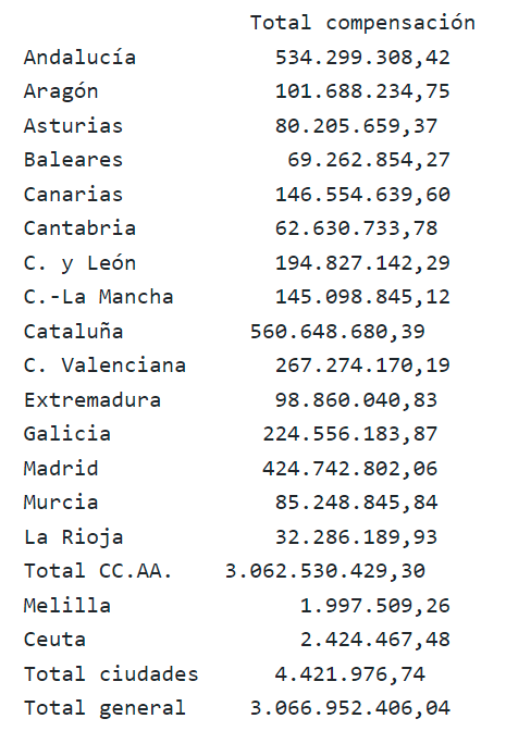 El siguiente cuadro recoge (en euros) las cantidades correspondientes a cada comunidad de régimen común y ciudad autónoma: