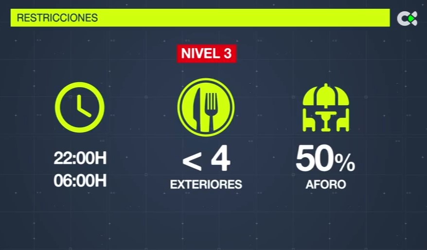 La ocupación máxima por mesa pasa a ser de 4 personas en espacios interiores y en espacios al aire libre en todos los niveles.