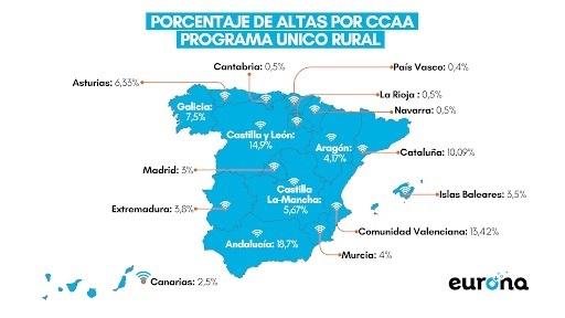 Las comunidades autónomas de Andalucía (18,7%), Castilla y León (14,9%), Comunidad Valenciana (13,4%) y Cataluña (10,1%) suman el 57% de las nuevas altas tras un mes de funcionamiento del Programa UNICO rural, según datos de Eurona, compañía especializada en servicios y soluciones de conectividad para zonas rurales y remotas que ha elaborado estos datos después de analizar los 1.200 contratos de conexión al internet por satélite de 100 Mbps que ha realizado.