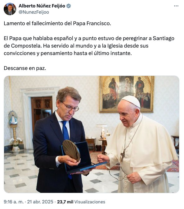 El líder del PP, Alberto Núñez Feijóo, también a través de la red social X ha lanzado un mensaje por la muerte del Pontífice. Feijóo ha destacado que el Papa estuvo a punto de peregrinar a Santiago de Compostela.
