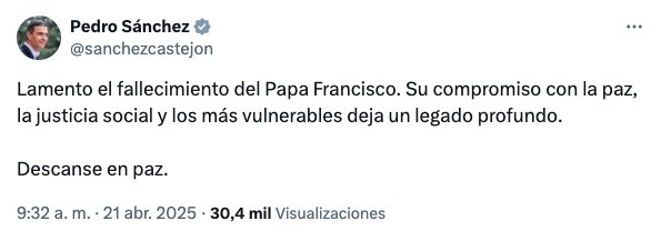 Pedro Sánchez, presidente del Gobierno de España, ha publicado en la red social X un mensaje lamentando el fallecimiento del Papa Francisco.