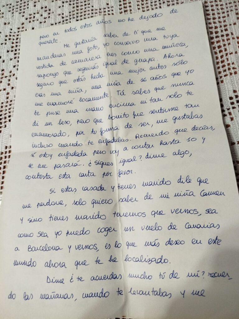 Pasaron los años. Antonio rehízo su vida en Maspalomas, donde se casó, tuvo hijos y más adelante se divorció. Pero, según relata la familia de Carme, nunca la olvidó. Décadas después, ya con 58 años, decidió buscarla con la ayuda de una emisora de radio. Consiguió su dirección y le escribió una carta romántica y emotiva con la esperanza de reavivar aquella conexión.