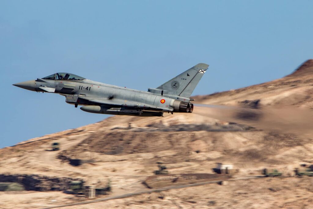Cinco Eurofighter del Ala 11 de la Base Aérea de Morón se han desplazado a la Base Aérea de Gando en Gran Canaria para llevar a cabo, a lo largo de esta semana, un entrenamiento conjunto con los F-18 Hornet del Ala 46, los “Halcones”.