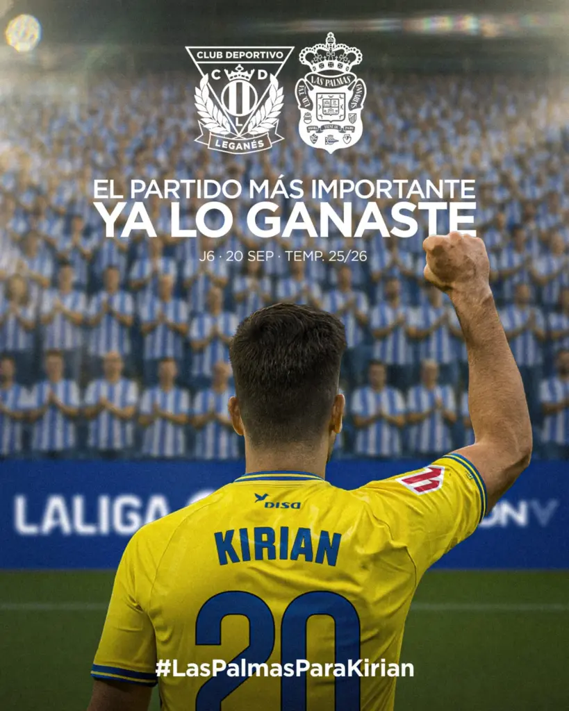 Antes de este encuentro el CD Leganés ha hecho un guiño a Kirian, de nuevo disponible y con el alta competitiva. El club madrileño ha publicado un cartel en el que se lee «El partido más importante ya lo ganaste». Quizás este sábado en el Estadio de Butarque se produzca la vuelta del jugador amarillo al terreno de juego.