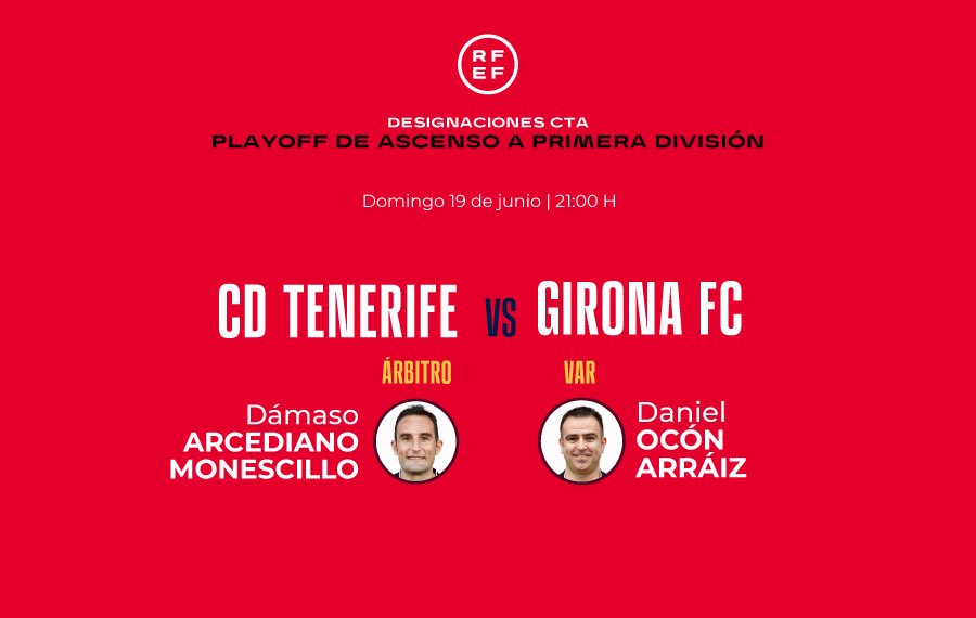 El árbitro designado para este choque entre el Tenerife y el Girona es Dámaso Arcediano Monescillo. Pertenece al Comité de Árbitros de Castilla La Mancha. Desde el 2011 se encuentra pitando encuentros en Segunda División, a donde ascendió tras cuatro años dirigiendo encuentros en Segunda División B.