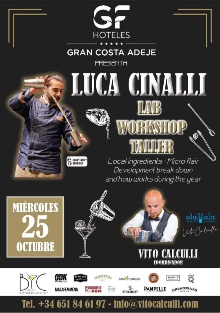 Vito Calculli imparte la semana entrante juntoal italiano Luca Cinalli un Seminario de alto nivel sobre las últimas tendencias en Mixología, (el Arte y la Ciencia de mezclar bebidas), dirigido a profesionales. Será el próximo día 25 de octubre en el Hotel GF Gran Costa, en Adeje en Tenerife.