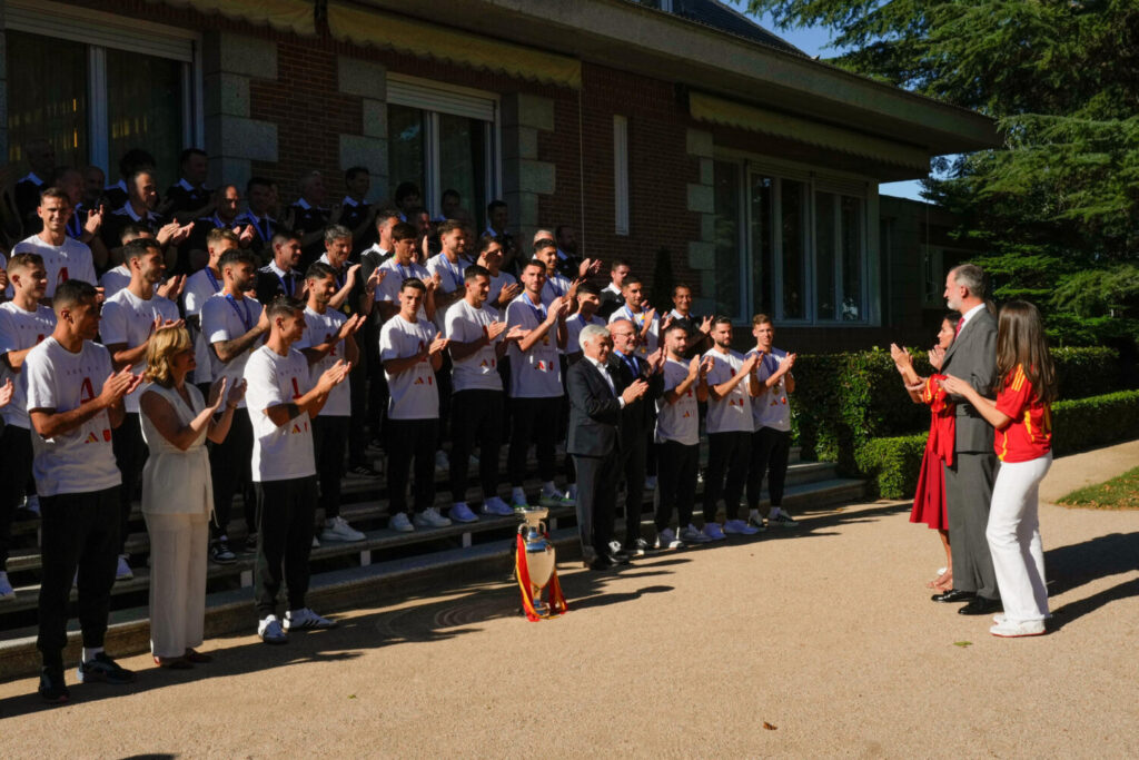 Posteriormente, Felipe VI, los dirigentes, el cuerpo técnico y los jugadores posaron en las escalinatas de acceso al Palacio de la Zarzuela, donde la Familia Real cogió el trofeo que acredita a España como campeona de la Eurocopa, sexto entorchado para ‘la Roja’ tras tres Eurocopas (1964, 2008 y 2012), un Mundial (2010) y una Liga de Naciones (2023).